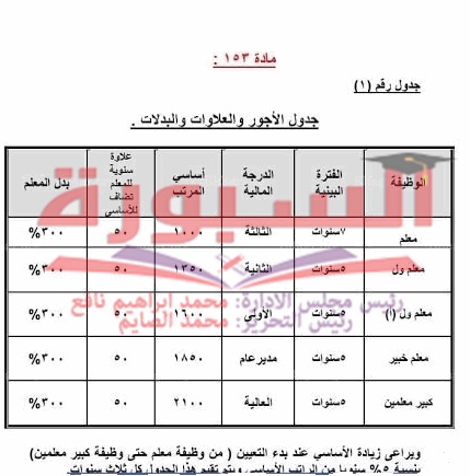 ينشر موقع السبورة التعليمى جدول الأجور والعلاوات والبدلات المنصوص عليه فى قانون التعليم الجديد والذى سوف يتم طرحه بعد ايام على موقع وزارة التربية والتعليم للمناقشة على المعلمين والمهتمين بالعملية التعليمية.