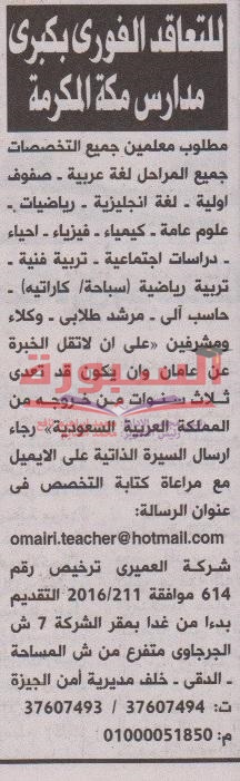 تعلن مدارس كبرى بمكة المكرمة عن حاجتها الى التعاقد مع معلمين فورا، ولمزيد من التفاصيل عبر الاعلان التالى من جريدة الأهرام.