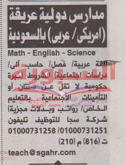تعلن مدارس دولية عريقة (عربى/ أمريكى) بالمملكة العربية السعودية عن حاجتها الى معلمين فى جميع التخصصات، ولمزيد من التفاصيل فى الاعلان التالى المنشورة فى جريدة الاهرام.