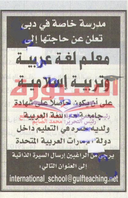تعلن مدرسة خاصة فى دبى بالامارات العربية المتحدة عن حاجتها الى معلمين لغة عربية وتربية اسلامية، ولمزيد من التفاصيل عبر الاعلان التالى: