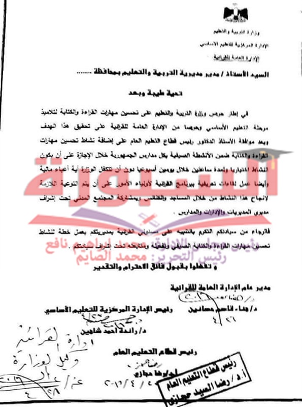 أرسلت وزارة التربية والتعليم الى المديريات التعليمية فاكشا بشأن اضافة نشاط تحسين مهارات القراءة والكتابة ضمن الأنشطة الصيفية بالمدارس.