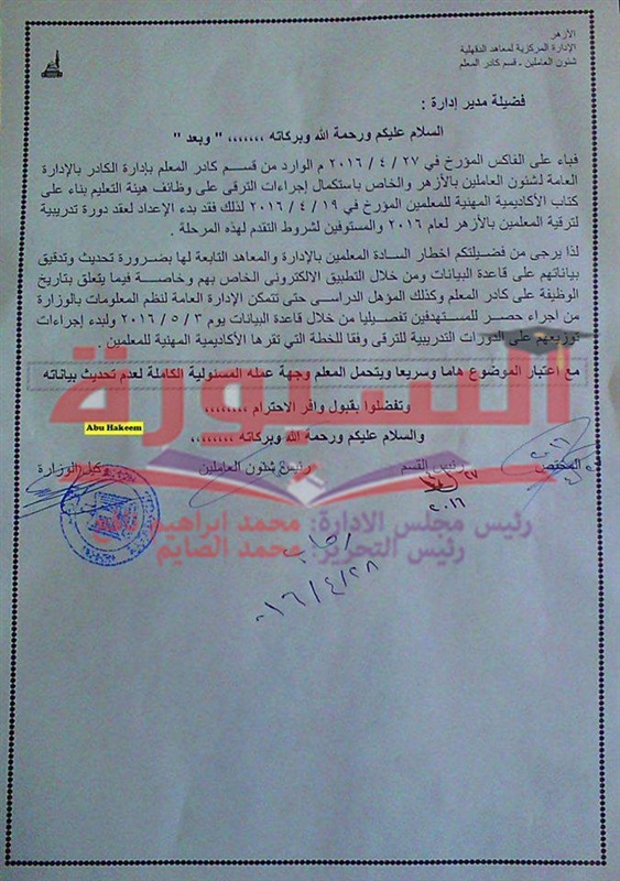 تنشر "السبورة" فاكس من الإدارة المركزية لمعاهد الدقهلية والخاص باستكمال إجراءات الترقي علي وظائف هيئة التعليم والذي تضمن الاتي: