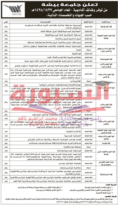 تعلن جامعة بيشة بالمملكة العربية السعودية للعام الجامعي 2017/2016، عن حاجتها الى أعضاء هيئة تدريس فى جميع كلياتها، ولمزيد من التفاصيل فى الاعلان التالى: