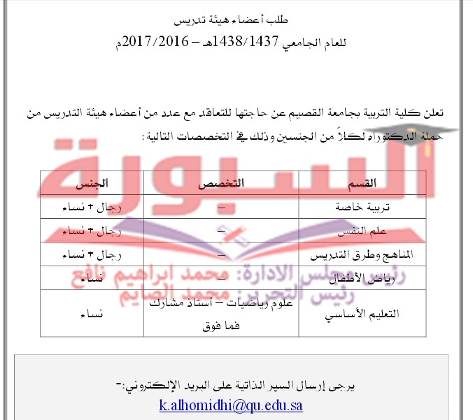 تعلن كلية التربية بجامعة القصيم عن حاجتها للتعاقد مع عدد من أعضاء هيئة التدريس من حملة الدكتوراه لكلاً من الجنسين وذلك في التخصصات التالية: