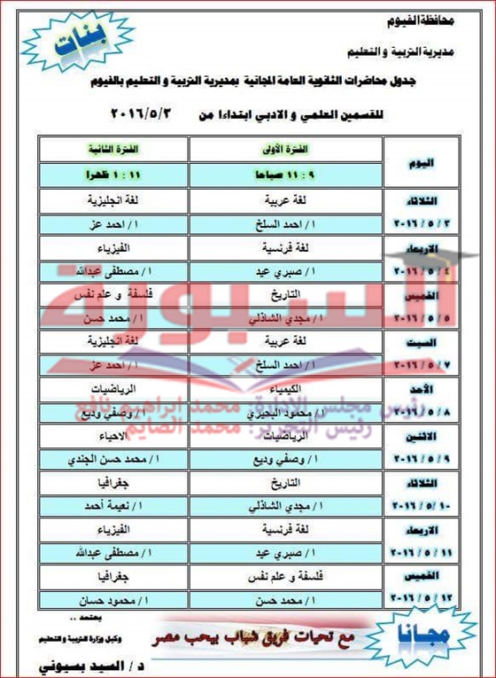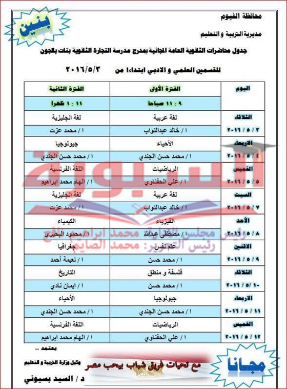 ننشر| جدول المجموعات المجانية للثانوية العامة