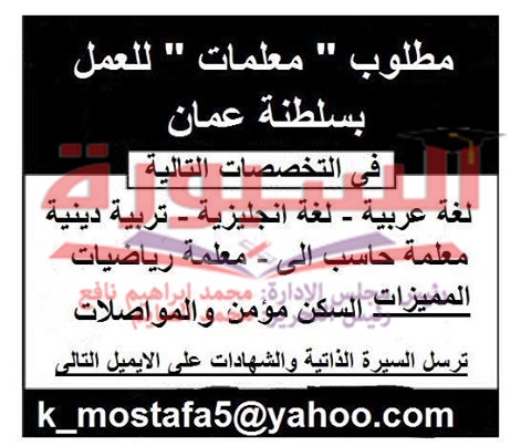 تعلن احدى المدارس بسلطنة عمان عن حاجتها الى معلمات فى جميع التخصصات، ولمزيد من التفاصيل على الاعلان التالى: