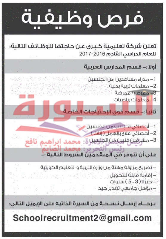 اعلنت عدد من المدارس الخاصة فى دولة عن حاجتها للتعاقد مع عدد من المعلمين للعام الدراسى المقبل 017/2016، وذلك في التخصصات التالية: