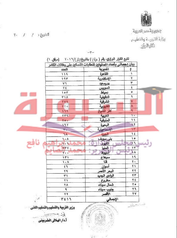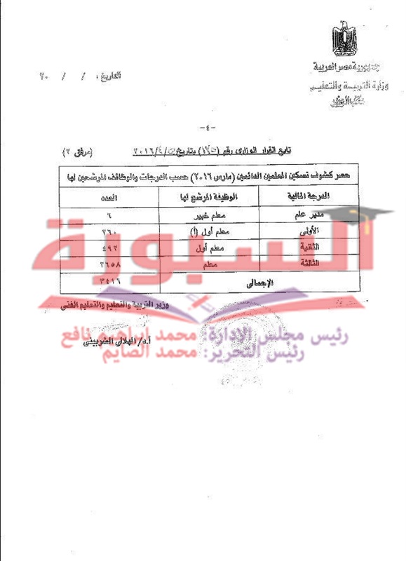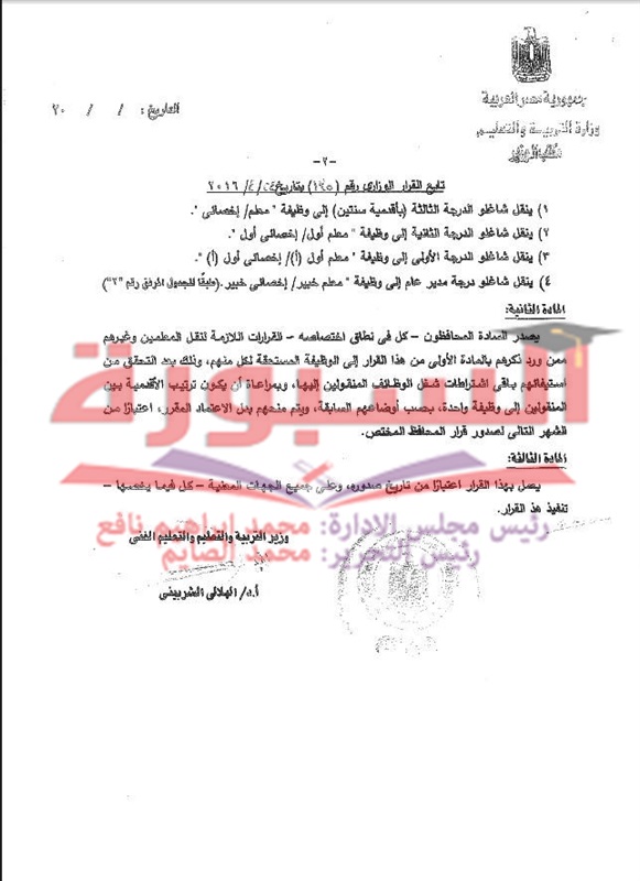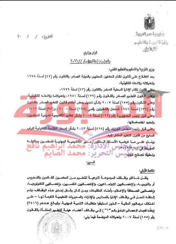 ينشر موقع السبورة التعليمى القرار الوزاري رقم 135 بتاريخ 24 أبريل 2016 بشأن نقل شاغلو وظائف المجموعة النوعية للتعليم من المعلمين القائمين بالتدريس او التوجيه الذين استوفوا متطلبات التنمية المهنية.