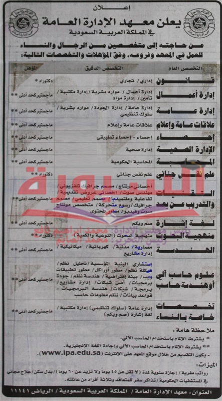 يعلن معهد الإدارة العامة في المملكة العربية السعودية عن حاجته للتعاقد مع اعضاء هيئة تدريس وذلك في التخصصات التالية: