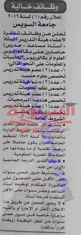 تعلن جامعة السويس عن حاجتها الى اعضاء هيئة التدريس فى جميع التخصصات (استاذ، استاذ مساعد، مدرس) من الحاصلين على بكالوريوس العلوم أو بكالوريس الحاسبات والمعلومات، ولمزيد من التفاصيل على الاعلان التالى المنشور فى جريدة الأخبار.