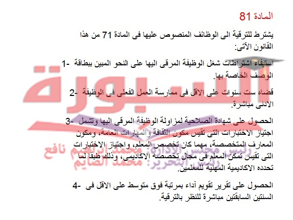 ينشر موقع السبورة التعليمى الشروط الجديدة لترقية المعليمن فى قانون التعليم الجديد، والذى تم عرضه على نقابة المعلمين لإبداء آرائها فيه، ومن ثم عرضه على مجلس الوزراء، ومجلس النواب لاقراره، حيث جاءت المادة رقم 81 والتى تنص على شروط ترقية المعلم للوظائف التالية: