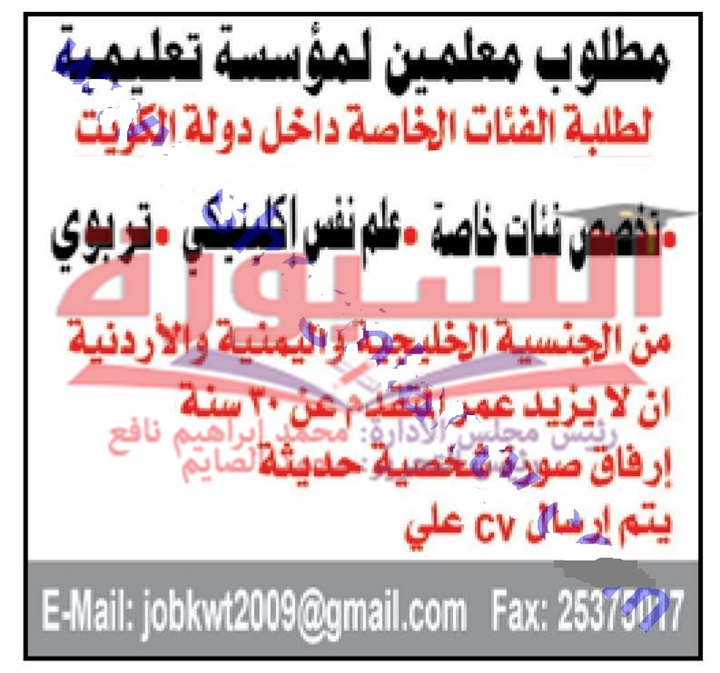تعلن مؤسسة تعليمية كبرى بالكويت عن حاجتها لمعلمين فى تخصصات (فئات خاصة، علم نفس إكلينيكى،تربوى)، ولمزيد من التفاصيل فى الاعلان التالى