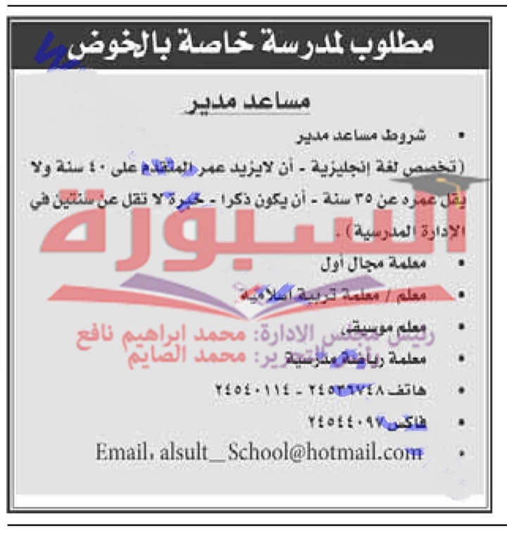تعلن احدى المدارس الخاصة بسلطنة عمان عن حاجتها الى معلمين ومدير مدرسة، وعلى الراغبين فى التقدم ارسال السيرة الذاتية على الايميل اسفل الاعلان التالى: