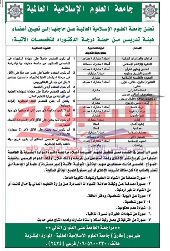 تعلن جامعة العلوم الاسلامية الأردنية عن وظائف شاغرة لأعضاء هيئة التدريس وذلك في التخصصات التالية:
