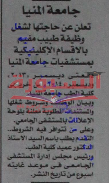 تعلن جامعة المنيا عن وظائف شاغرة وذلك في التخصصات التالي واليكم نص الاعلان: