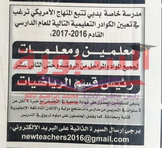 تعلن كبرى المدارس الخاصة بدبى عن حاجتها الى معلمين فى جميع التخصصات.. التفاصيل والشروط فى الاعلان التالى:-