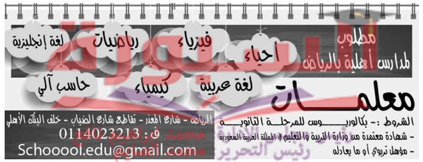 تعلن احدى المدارس الأهلية بالرياض بالمملكة العربية السعودية عن حاجتها الى معلمات فى جميع التخصصات، وعلى الراغبين فى التقدم والمزيد عبر الاعلان التالى: