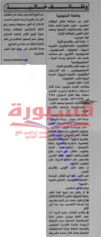 تعلن جامعة المنوفية عن حاجتها الى معيدين فى كلية الطب، وعلى الراغبين فى التقدم تقديم الطلبات باسم السيد عميد الكلية، ولمزيد من التفاصيل عبر الاعلان التالى: