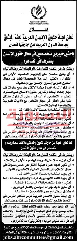 تعلن لجنة حقوق الانسان العربية لجنة الميثاق بجامعة الدول العربية، عن حاجتها الى شغل بعض الوظائف الشاغرة، والوظائف المطلوبة كالتالي:-