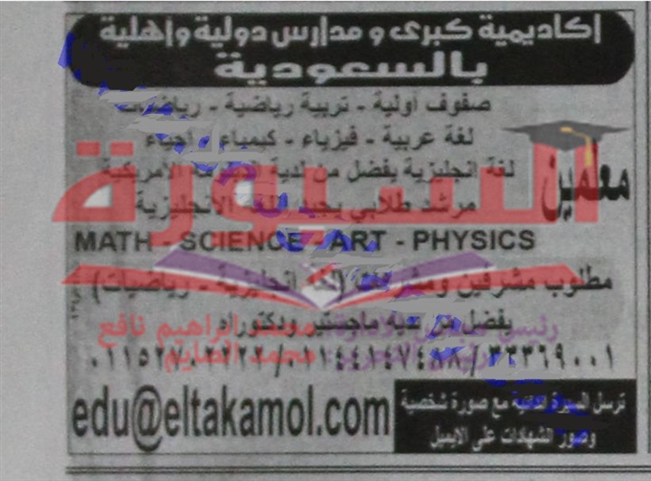 تعلن اكاديمية كبرى ومدارس دولية وأهلية بالمملكة العربية السعودية عن حاجتها الى معلمين وأعضاء هيئة تدريس للعمل فى جميع التخصصات، وعلى الراغبين فى التقدم ولمزيد من التفاصيل عبر الاعلان التالى: