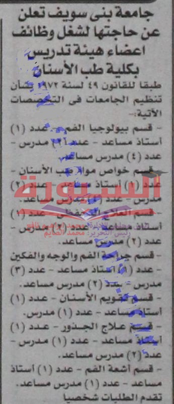 تعلن جامعة بنى سويف عن حاجتها الى اعضاء هيئة التدريس لكلية طب الأسنان، وعلى الراغبين فى التقدم من خلال الاعلان المنشور فى اليوم السبت الموافق 2016/5/14، فى جريدة اخبار اليوم.