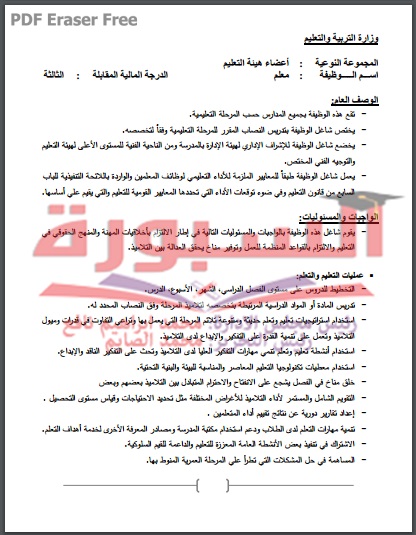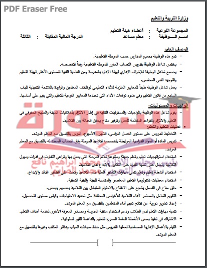 ينشر موقع السبورة التعليمى الوصف التوظيفى بالتعاون مع اكاديمية المهنية للمعلمين ووزارة التربية والتعليم، حيث نستعرض الوصف العام لوظيفة معلم مساعد والواجبات والمسئوليات والتنمية المهنية والتأهيل وضمان الجودة والاعتماد والمشاركة الاجتماعية وشروط شغل الوظيفة.