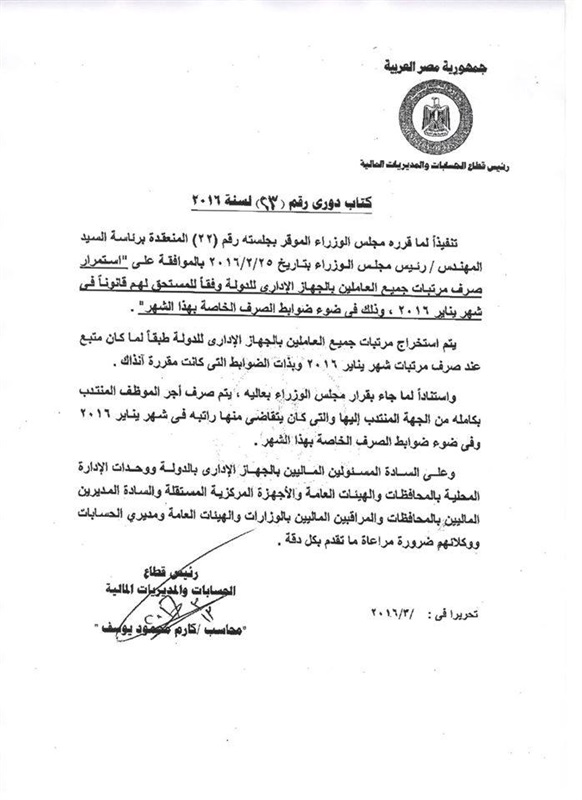 مرتبات جميع العاملين للجهاز الإدارى للدولة وفقاً للمستحق لهم قانوناً فى شهر يناير 2016 ( أى إستمرار
