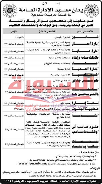 يعلن معهد الادارة العامة بالمملكة العربية السعودية عن حاجته الى متخصصين من الرجال والنساء للعمل فى المعهد وفروعه وفق المؤهلات والتخصصات المنشورة عبر الاعلان التالى: