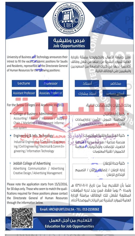 تعلن جامعة الاعمال والتكنولوجيا متمثلة بالادارة العامة للموارد البشرية عن رغبتها فى شغل وظائف اكاديمية لديها فى كليات الجامعة، ولمزيد من التفاصيل من خلال الاعلان التالى