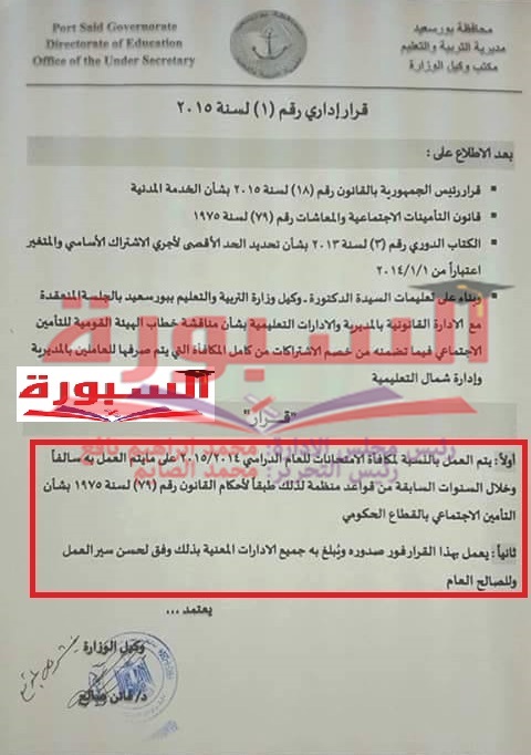 أصدرت مديرية التربية والتعليم بمحافظة بورسعيد قرارا اداريا رقم ( 1 ) لسنة 015