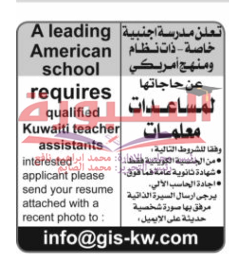 تعلن احدى المدارس الامريكية بدولة الكويت عن حاجتها الى معلمات، وعلى الراغبين فى التقدم الاطلاع الى الاعلان التالى: