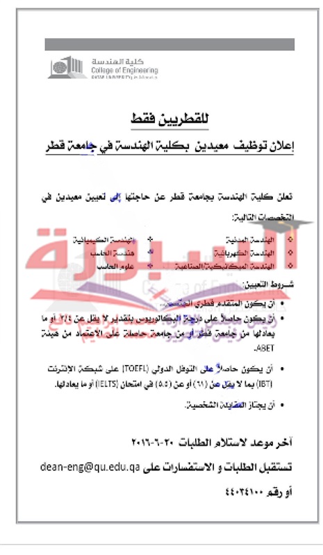أعلن كلية الهندسة بجامعة قطر عن حاجتها الى معيدين، ولمزيد من التفاصيل عبر الاعلان التالى: