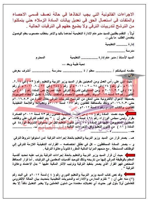 ينشر موقع السبورة التعليمى الاجراءات القانونية التى تحق للمعلمين المعينين بالقرارات 53 و74 و244 الصادر بحقهم التضرر اتخاذها للتسجيل وتعديل البيانات الخاصة بهم لامكانية التسجيل على تدريبات الترقية حيث يمكن لكل معلم كتابة تلك الشكوى المتضمنه كل الحقوق القانونية مباشرة وتقديمها للشئون القانونية للادارة التابع لها المعلم وتقديم نسخة اخرى لوكيل وزارة التربية والتعليم بعلم الوصول لليد او بالفاكس ان وجد بالمحافظة التابع لها المعلم المتضرر وتقديم صيغه اخرى لمدير عام الشئون القانونية بمديرية التربية والتعليم.
