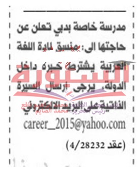 تعلن احدى المدارس الخاصة بامارة دبى بالامارات العربية المتحدة عن حاجتها الى معلمين، وعلى الراغبين فى التقدم ارسال السيرة الذاتية على الايميل المنشور فى الاعلان التالى: