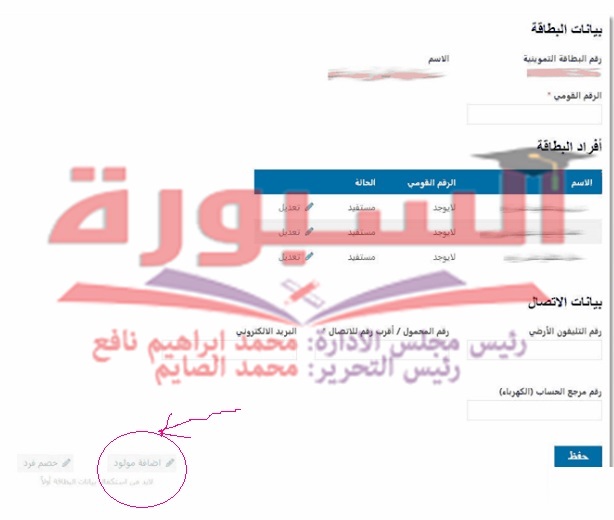 يجب استكمال بيانات الأفراد أولاً حتى تتم عملية إضافة المولود إلى بطاقة التموين بنجاح.