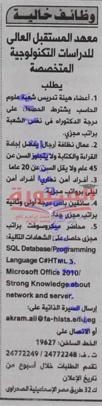 يعلن معهد المستقبل العالى للدراسات التكنولوجيا المتخصصة عن أعضاء هيئة التدريس، ولمزيد من التفاصيل عبر الاعلان التالى: