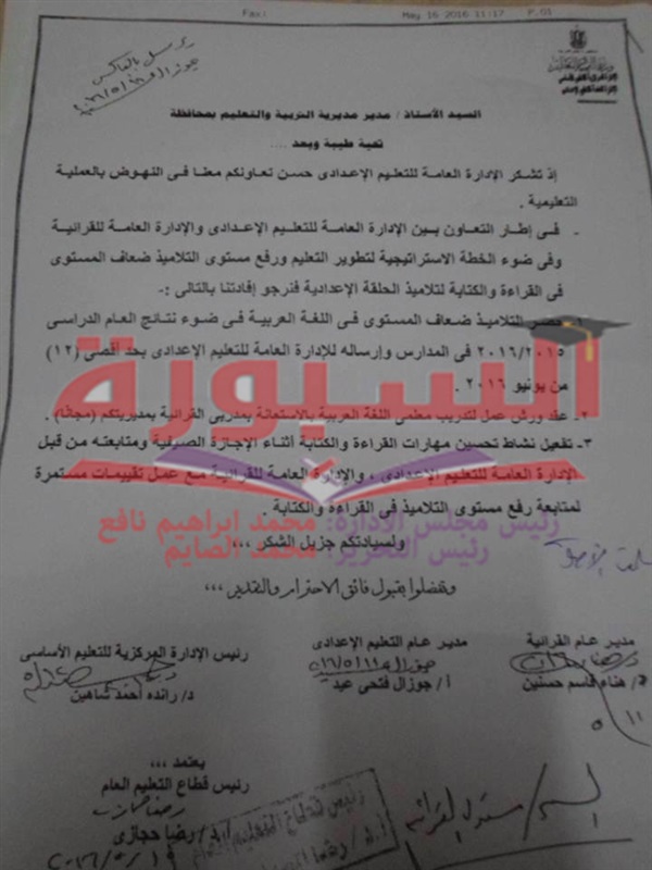 ارسلت وزارة التربية والتعليم فاكسا الى المديريات التعليمية تطالبها بحصر أسماء الطلاب الضعاف فى اللغة العربية فى المرحلة الاعدادية فى ضوء نتائج العام الدراسى 2016/2015، فى المدارس وارساله الى الادارة العامة للتعليم الاعدادى بحد أقصى 12 من يونيو.