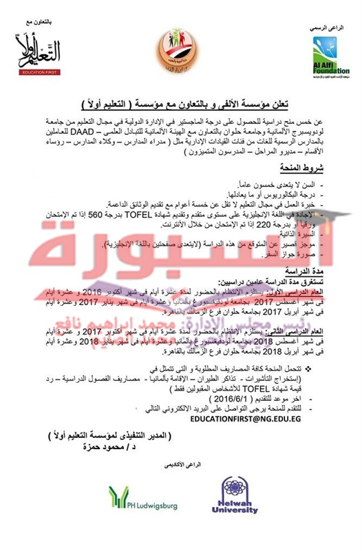 تعلن مؤسسة الألفي بالتعاون مع مؤسسة (التعليم اولا) عن تقديم منح دراسية للحصول علي الماجستير في مجال التعليم واليكم التفاصيل:-