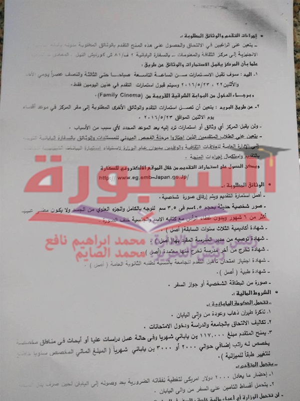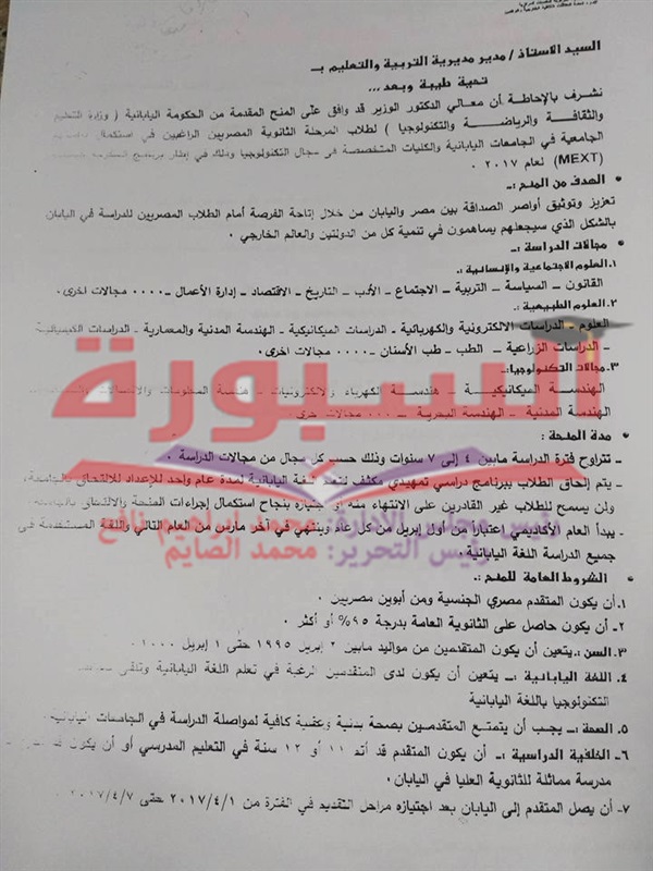 بالمستندات| ننشر الشروط الواجب توافرها فى الطلاب المتقدمين للمنحة اليابانية التى أقرها التعليم