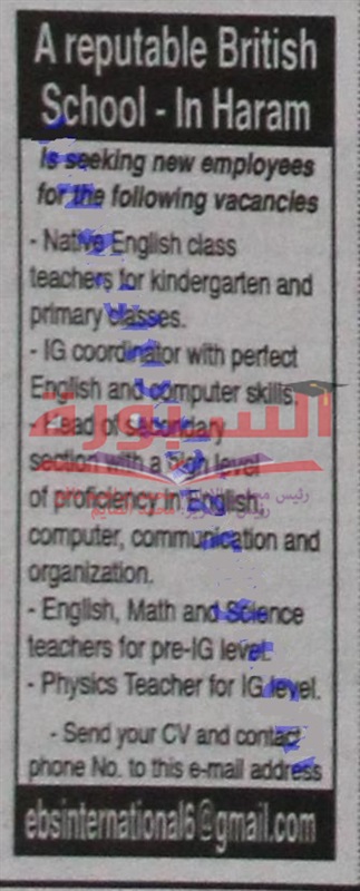 تعلن احدى المدارس البريطانية فى منطقة الهرم عن حاجتها الى معلمين فى مادتى اللغة الانجليزية والفيزياء، وعلى الراغبين فى التقدم ارسال السيرة الذاتية على الايميل المذكر فى الاعلان المنشور فى جريدة الاهرام.