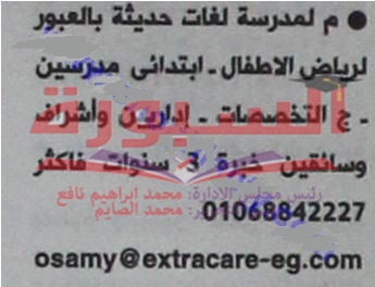 تعلن أحدى المدارس اللغات الحديثة بمدينة العبور عن حاجتها الى معلمين فى جميع التخصصات، وعلى الراغبين فى التقدم ارسال السيرة الذاتية عبر الايميل المتواجد فى الاعلان المنشور بجريدة الاهرام.