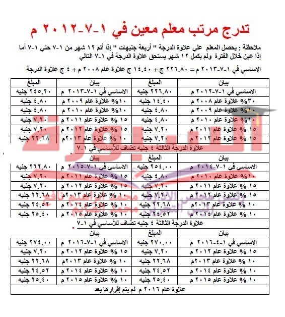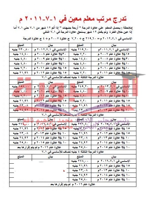 ننشر جداول تدرج مرتبات المعلمين المعينين من أول يوليو 2011 حتى أول يوليو 2014 ومقدار العلاوات المضافة