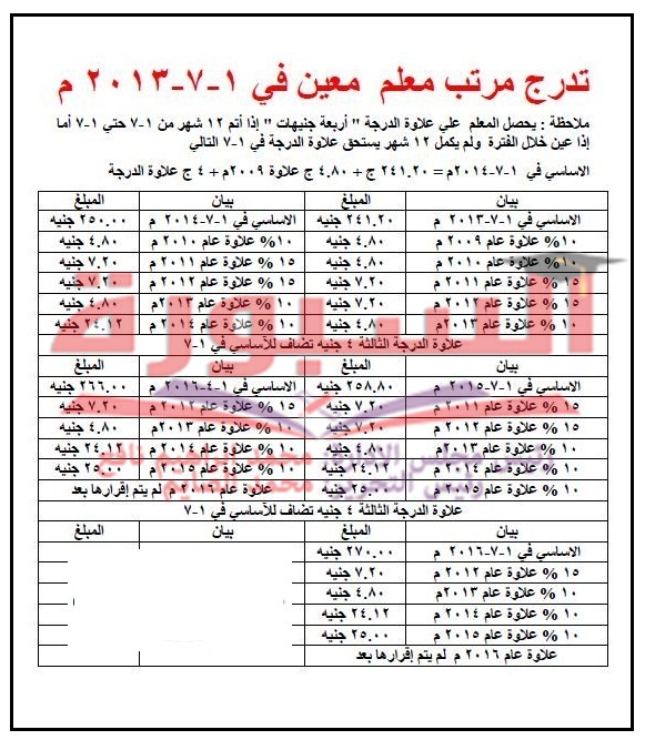 ينشر موقع السبورة التعليمى جداول لتدرج مرتبات المعلمين بداية من أول يوليو 2011حتى أول يوليو 2014.