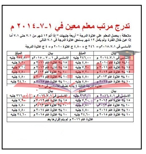 وتضاف علاوة الدرجة 4 جنيه للاساسى فى 1 / 7 ويتم اضافة العلاوات للوصول للراتب فى 2016 على النحو التالى :