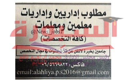 تعلن مدارس الامارات عن حاجتها الى معلمين ومعلمات واداريبن واداريات، وعلى الراغبين للتقدم ارسال السيرة الذاتية فى الايميل المنشور بالاعلان التالى:-