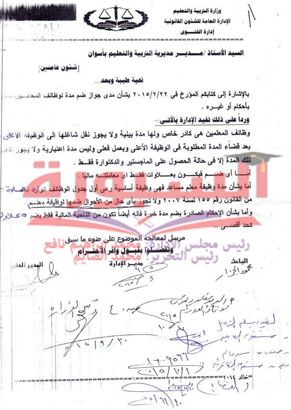 ينشر موقع السبورة التعليمى جواز ضم مدة لوظائف المعلمين باحكام أو بغيره، حيث اجابت إدارة الفتوى بالرد على الكتاب المؤرخ فى 2015/2/3/22، الوارد من مدير مديرية التربية والتعليم بأسوان، حيث جاء الرد كالتالى: