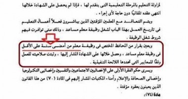 ينشر موقع السبورة التعليمى المادة 73 من قانون 93 لسنة 2012 لتعديل قانون 155 لسنة 2007، والتى نصت على أن يكون شغل وظيفة معلم مساعد بالتعاقد لمدة سنتين قابلة للتجديد سنة اخرى بقرار من وزير التربية والتعليم ويجب على شاغلها خلالها هذة الفترة الحصول على شهادة الصلاحية لمزاولة التعليم بالمرحلة التعليمية ويعيين المعلم المساعد فى وظيفة معلم بقرار من المحافظ لكل من امضى سنة على الاقل بوظيفة المعلم المساعد بشرط ان يكون مستوفى الشروط وفقا للمعايير التى تحددها اللائحة التنفيذية ويقصد باستيفاء الشروط هنا ان يكون حاصل على شهادة التاهيل التربوى وذلك لخريجى غير تربية وان يكون اجتاز تدريب التطبيقات التربوية من خلال الاكاديمية المهنية للمعلمين وفقا للمعايير.
