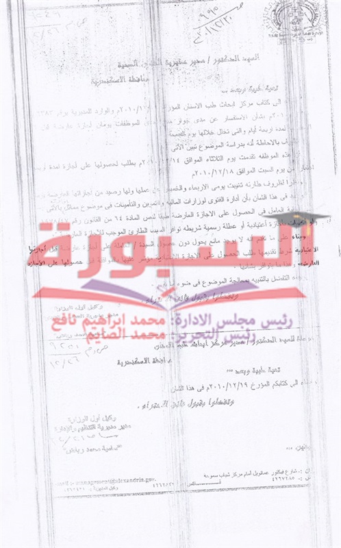 ينشر موقع السبورة كتاب مديرية التنظيم والادارة بالاسكندرية إلى الدكتور مدير مديرية الشئون الصحية بالاسكندرية بشأن أحقية العامل في الحصول على إجازة عارضة طبقا لنص المادة 64 من القانون رقم 47 لسنة 1978م وتعديلاته ولو اتصلت باجازة اعتيادية أو عطلة رسمية شريطة توافر السبب الطارئ الموجب للاجازة العارضة بناءًا علي فتوي إدارة الفتوي لوزارات المالية والتموين والتأمينات شريطة تقديم طلب الحصول علي الاجازة الاعتيادية مؤشر عليها بالموافقة قبل حصوله علي الاجازة العارضة .