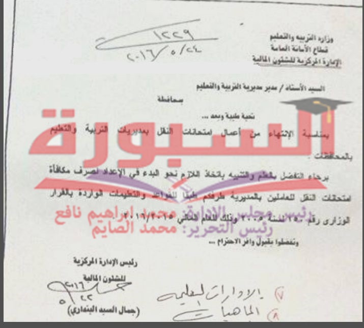 قامت الادارة المركزية للشئون المالية بوزارة التربية والتعليم بارسال الفاكس الخاص لبدء صرف مكافاة الامتحاتات الى المديريات التعليمة المختلفة