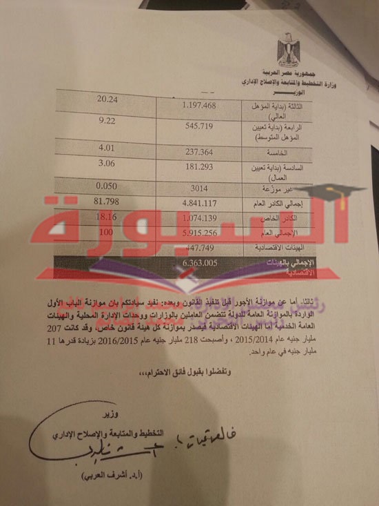 ينشر موقع السبورة التعليمى نص الخطاب المرسل من وزارة التخطيط والمتابعة والإصلاح الإدارى إلى مجلس النواب برئاسة الدكتور على عبد العال، رئيس المجلس، بشأن الجهات والهيئات التى يطبق عليها قانون الخدمة المدنية وأعدادهم وموازنة أجورهم، وذلك بناء على الخطاب المرسل من لجنة القوى العاملة للوزارة لموافاتها بأسماء هذه الجهات.